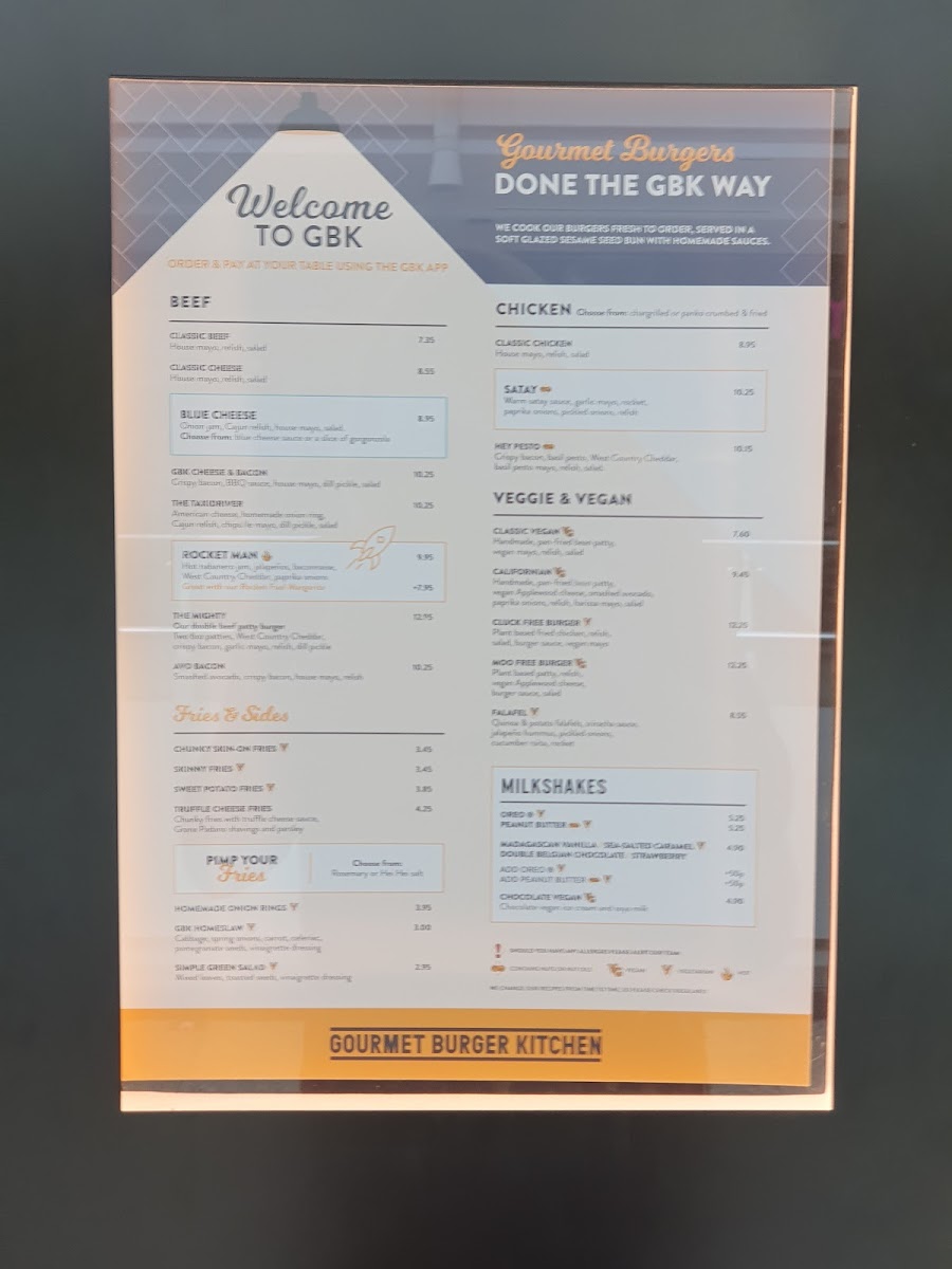 Welcome to Gourmet Burger Kitchen (GBK), located in The Mall, Cribbs Causeway, Bristol. If you're ready to elevate your burger experience, GBK is the perfect stop. The moment you walk in, a friendly staff member greets you, guiding you through their enticing menu and daily deals.